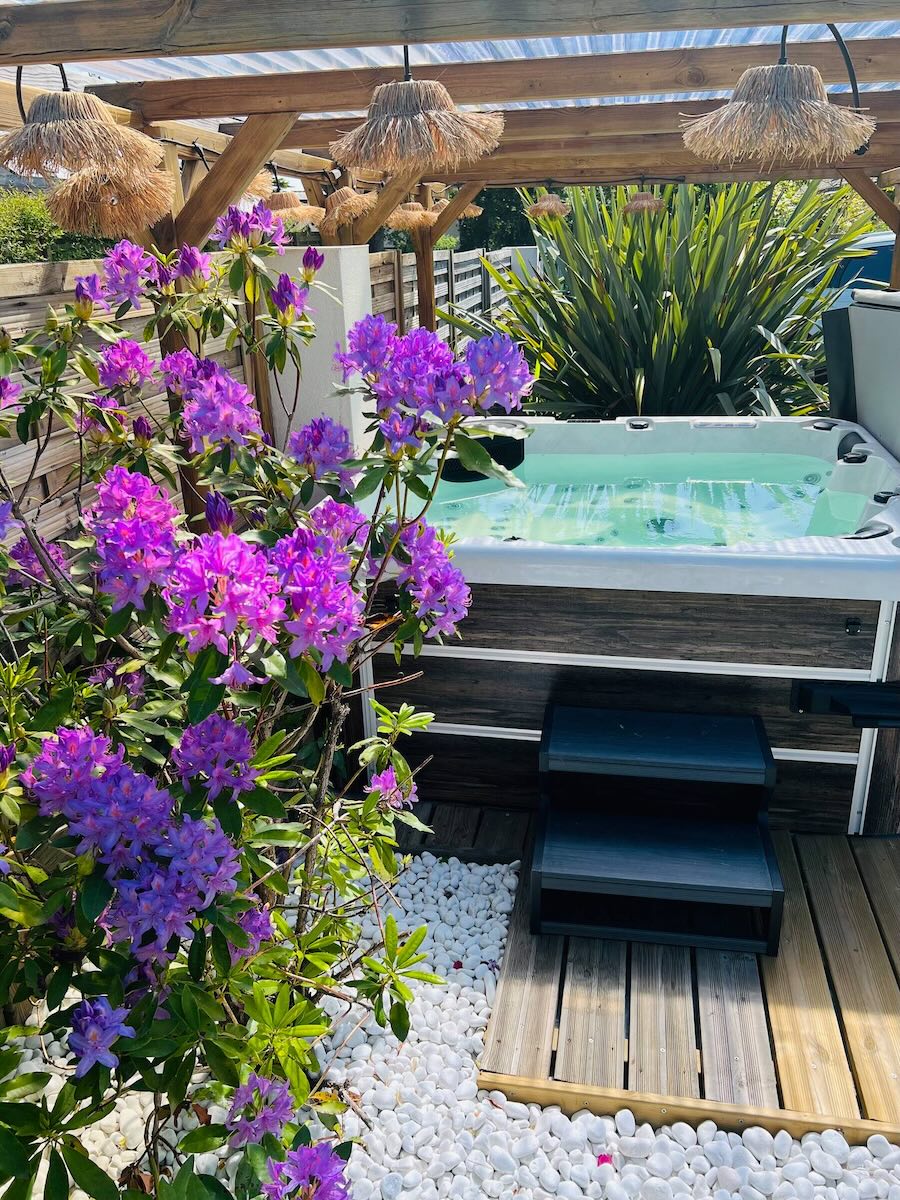 Jacuzzi 5 places dont 2 allongées dispo d’octobre à fin avril : en photo sous la pergola bois. Placé devant la suite parentale.
